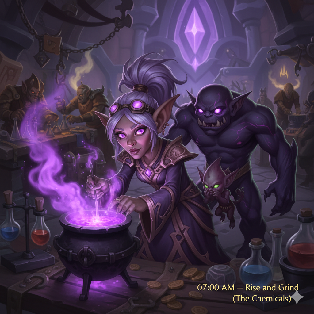 First order of business: Alchemy. The market for Algari Mana Potions is spiking, so I spend an hour bent over my portable cauldron. My Imp, Zipnik, is complaining about the fumes. I told him if he complains again, I’m using him as fuel for my next [Chaos Bolt]. He shut up.